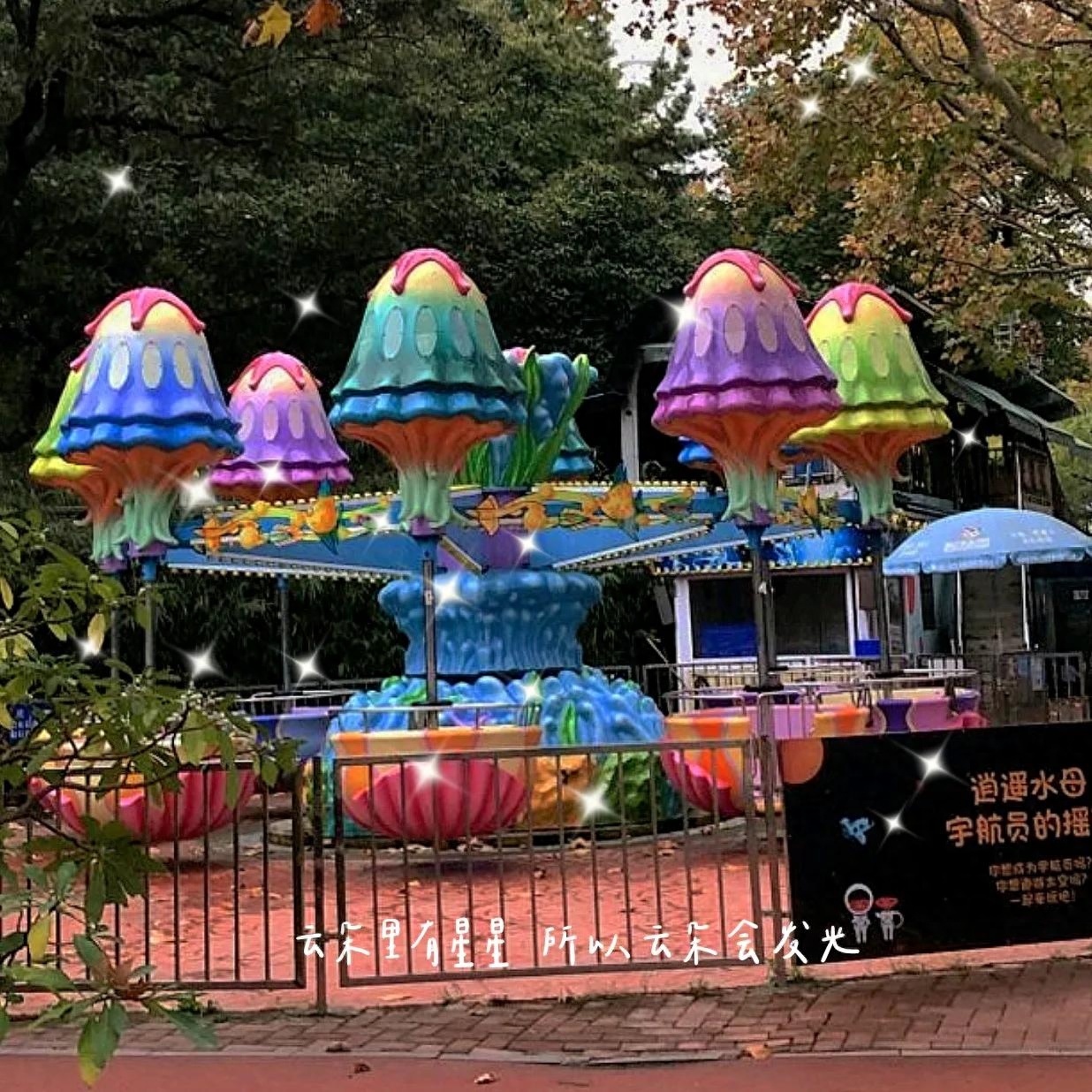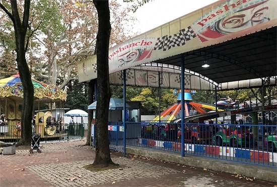 父母有的累了就干脆坐在路边的长凳上看手机,而孩子在不远处的游乐设施玩得不亦乐乎。