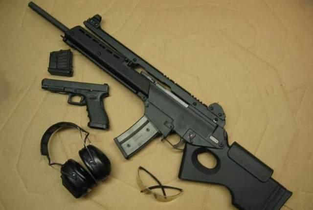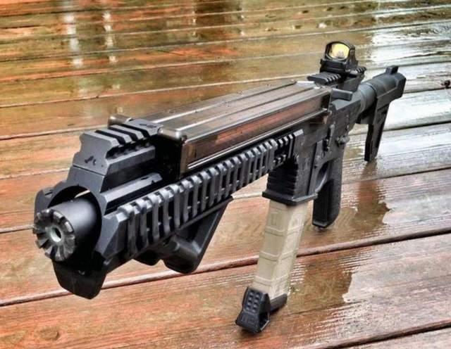 简单来说就是AR步枪和FN P90机枪的组合。看起来很奇怪。它可以在机匣顶部使用与FN P90机枪完全相同的50发水平弹匣,并发射可通过弹匣内部旋转的5.7×28毫米弹药。该装置采用改进的枪管,并形成与 P90 相同的发射原理。这种设计也被俗称为“AR57机枪”。