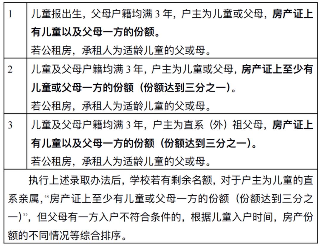 儿童与户主关系为直系三代之内,房屋产权人/承租人为儿童、父或母,并符合“五年一户”的规定(双胞胎、二胎除外)。学校将综合户籍迁入时间及房产情况等,根据以下顺序,按批次录取: