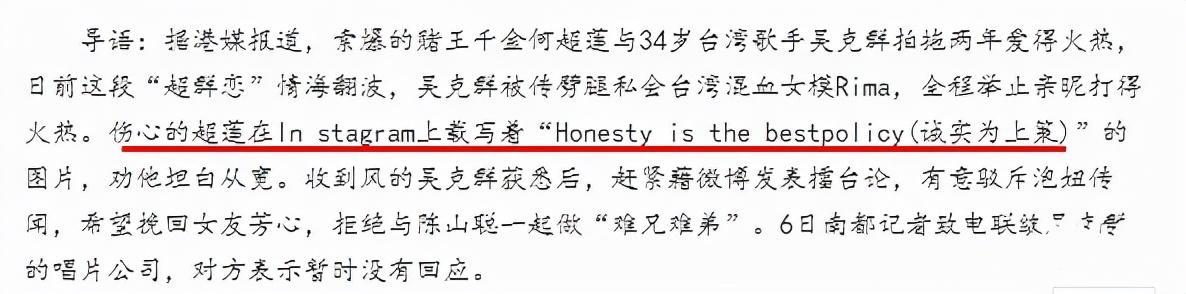 在外风流习惯的吴克群,被媒体拍到与混血女模特约会后,作为正牌女友的何超莲,终于忍无可忍在社交媒体上发声,告诫男友“诚实是上策”。