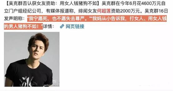 在吴克群花费四千六百万成立新公司后,媒体爆出女友何超莲资助了两千万,新闻一出,吴克群立马言辞激烈的反驳,说自己“宁愿死,也不愿失去尊严”,“用女人钱的男人猪狗不如”。