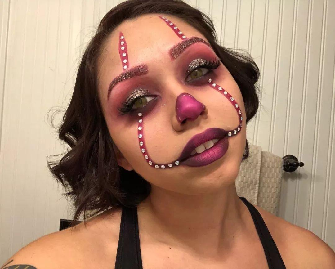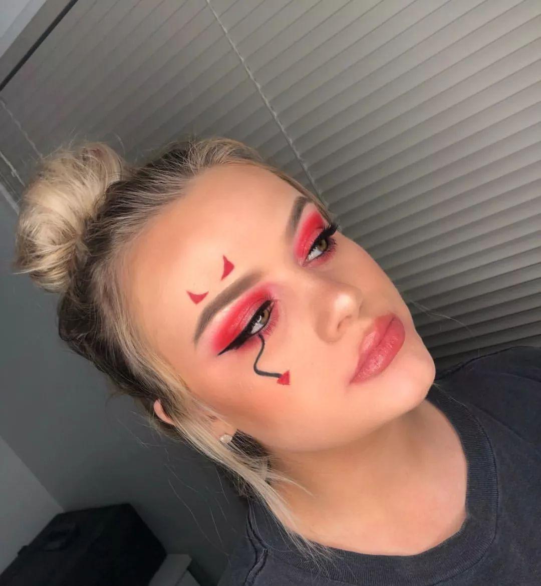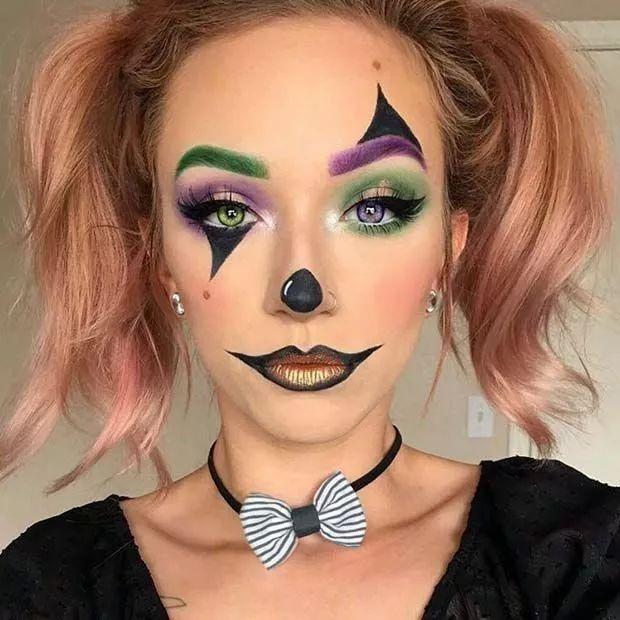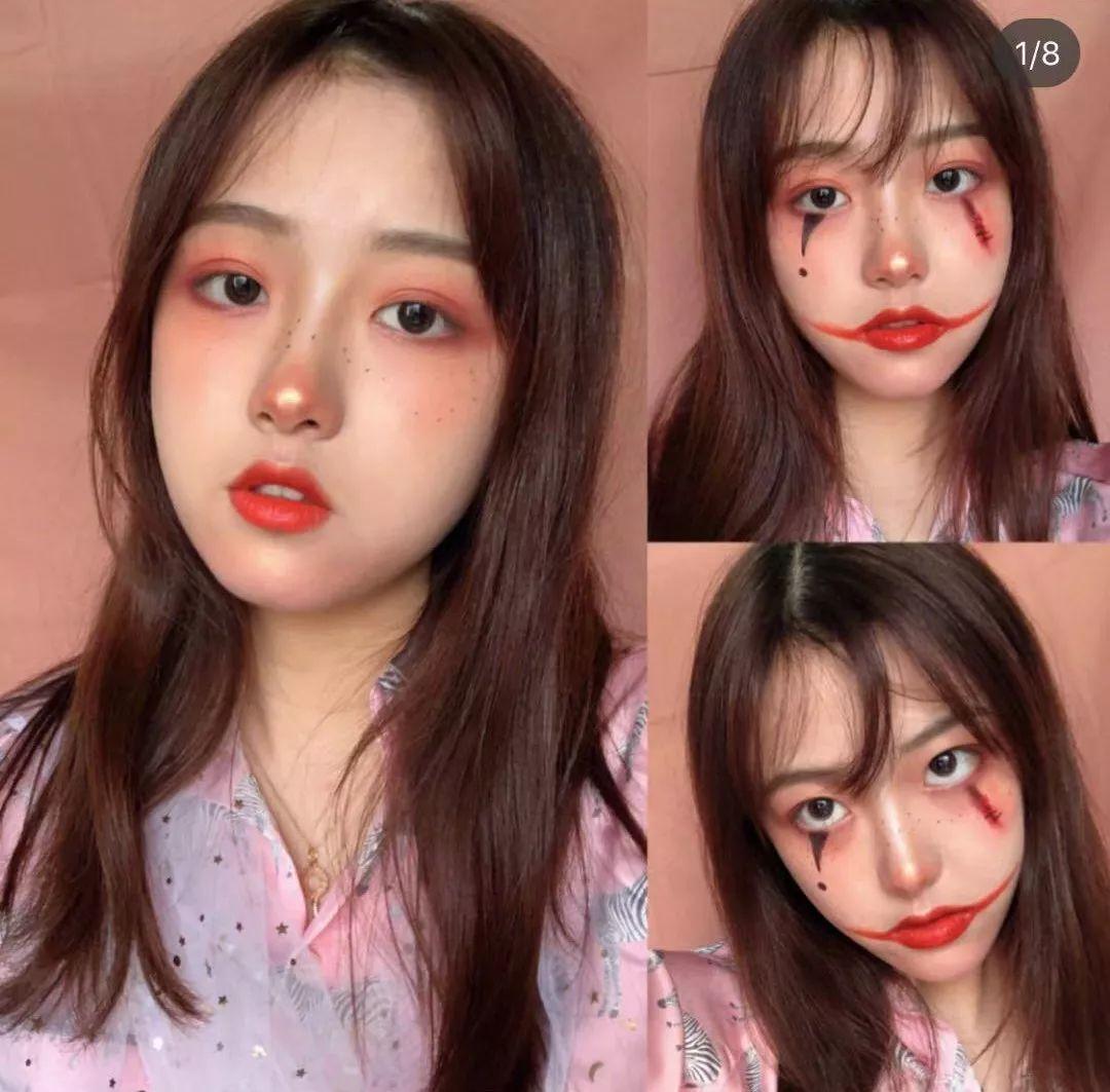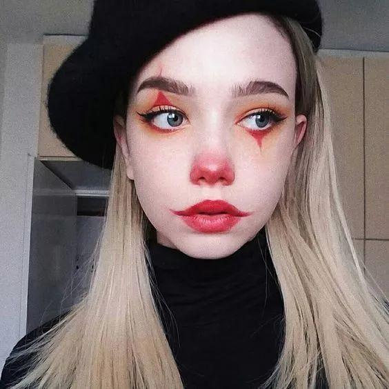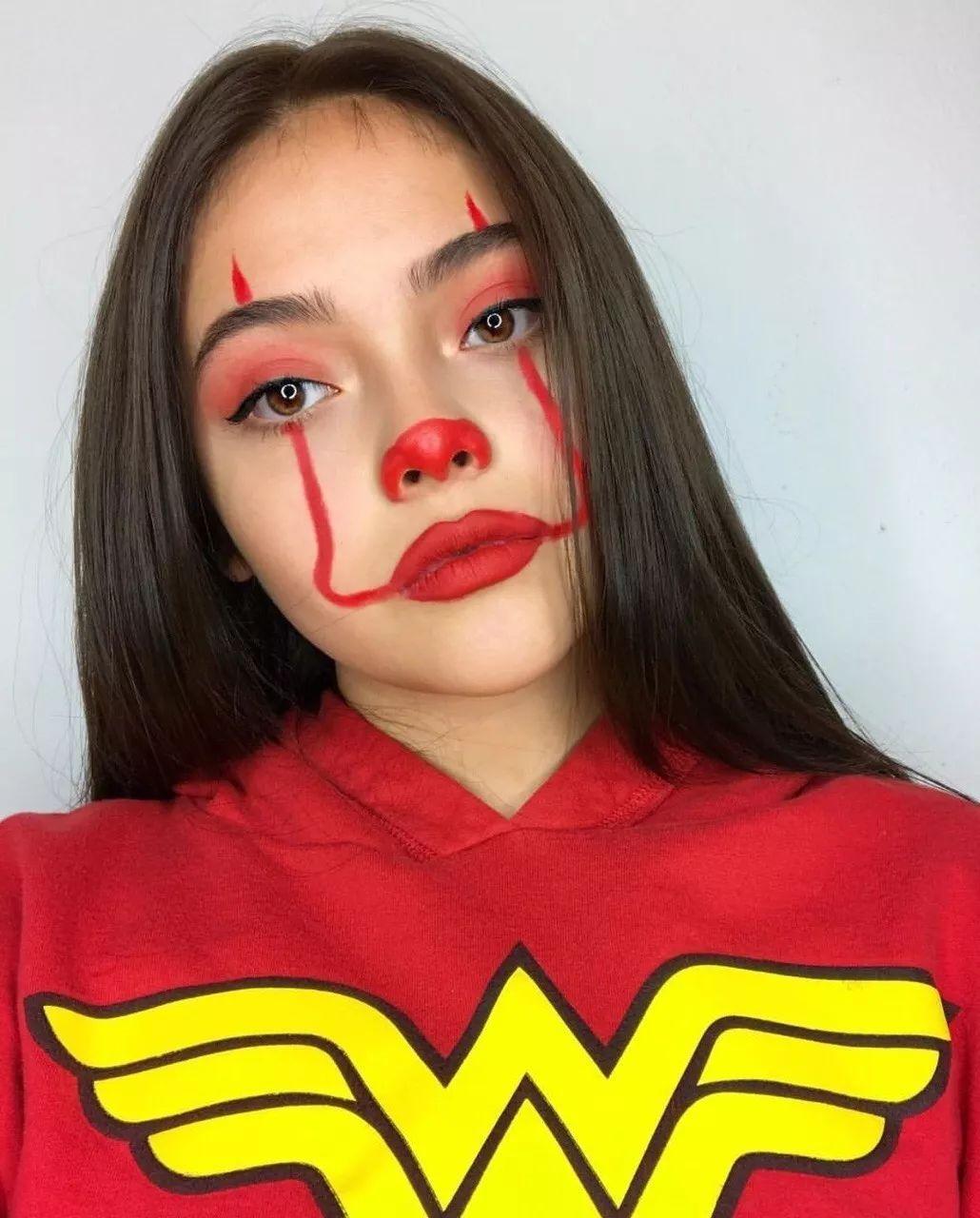 再给大家推荐的是自带萌点的小丑妆,容易上手,只需要在日常妆容的基础上,再添加一些小丑经典形象的元素就能抓住精髓。