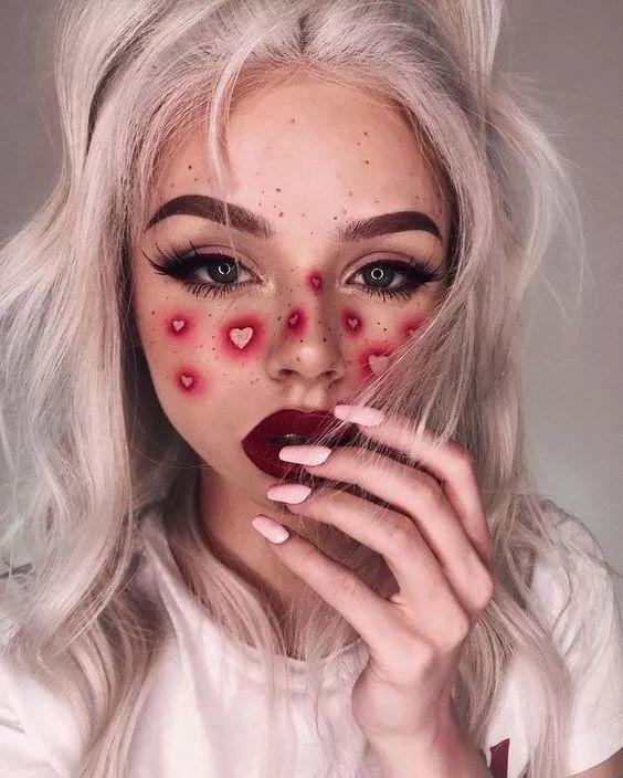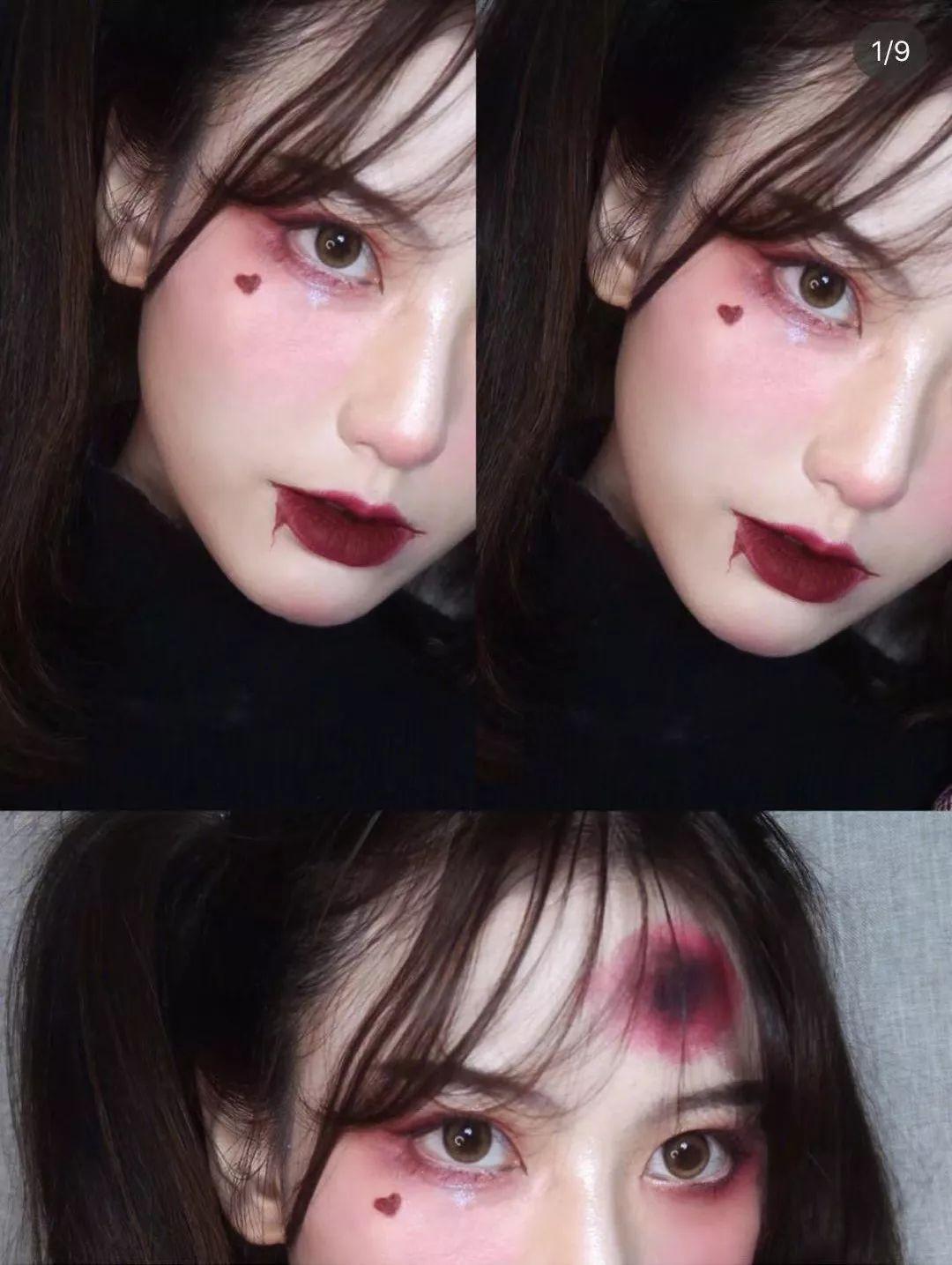 喷墨的爱心妆带一些血腥,正好符合万圣节的主题,原理其实很简单,先用腮红晕染出圆形后,用遮瑕笔画出爱心的形状~