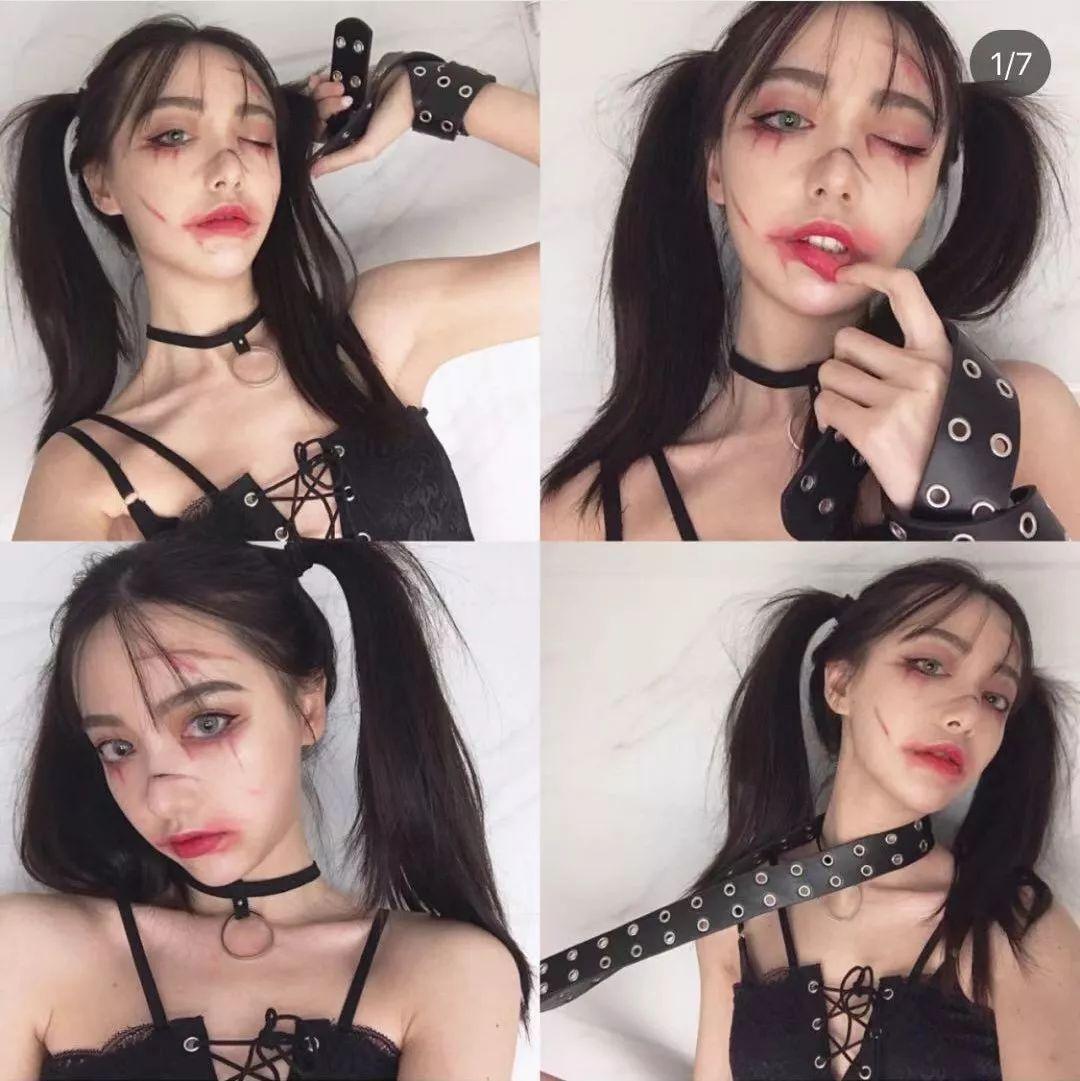 暗黑萝莉风的万圣节妆容,配上性感内搭很ok!