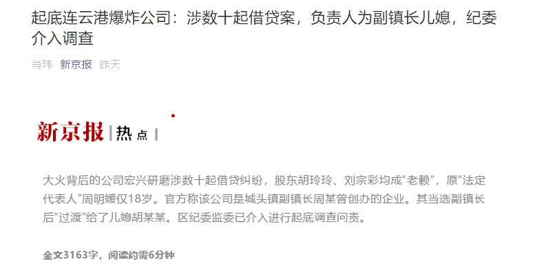 媒体查询“天眼查”发现,涉事企业连云港宏兴研磨材料有限公司成立于2006年1月,注册资本500万元,位于连云港市赣榆区城头镇黄墩村,主要从事加工并销售石英砂和硅微粉,公司法定代表人是胡玲玲。因多起案件未履行已生效判决,该公司被法院公示为失信公司。