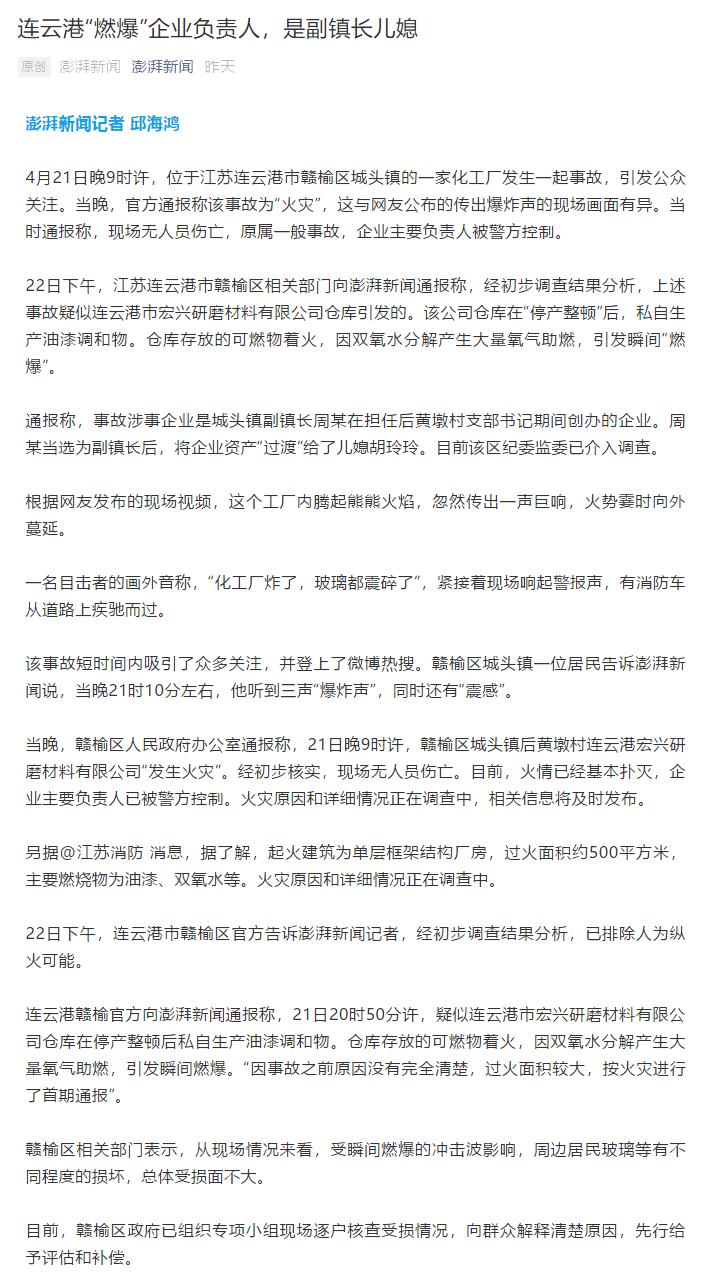 4月21日晚9时许,位于江苏连云港市赣榆区城头镇的一家化工厂发生一起事故。据澎湃新闻消息,22日下午,江苏连云港市赣榆区相关部门通报,经初步调查结果分析,上述事故为连云港市宏兴研磨材料有限公司仓库引发的。该公司仓库在“停产整顿”后,私自生产油漆调和物。仓库存放的可燃物着火,因双氧水分解产生大量氧气助燃,引发瞬间“燃爆”。