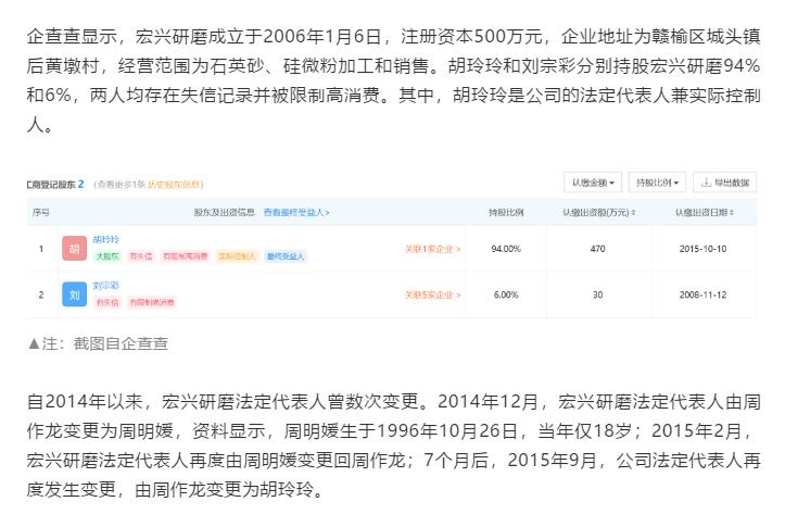 据新京报报道,自2014年以来,宏兴研磨法定代表人曾数次变更。2014年12月,宏兴研磨法定代表人由周作龙变更为周明媛,资料显示,周明媛生于1996年10月26日,当年仅18岁;2015年2月,宏兴研磨法定代表人再度由周明媛变更回周作龙;7个月后,2015年9月,公司法定代表人再度发生变更,由周作龙变更为胡玲玲。