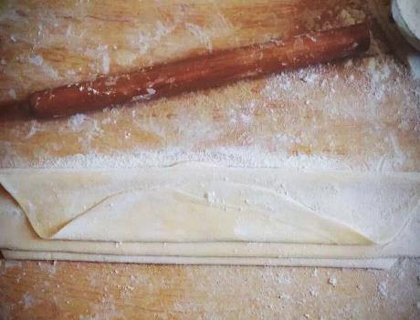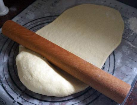 第三步,盖上一张湿布子,放在一旁静置30分钟,待醒好后,将面团移至在案板上,用擀面杖将面团擀开,然后在上面撒点干面粉,将面团裹在擀面杖上面继续擀,将面皮擀大擀薄;