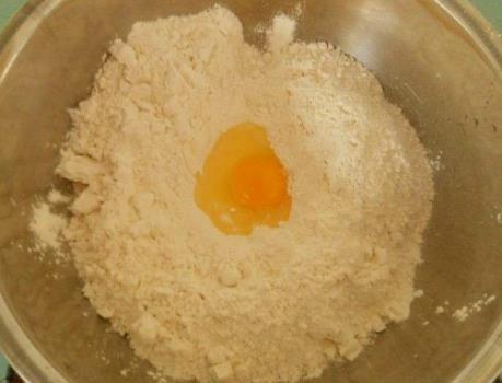 制作过程:第一步,面粉准备出需要的量,将其放入在和面盆中,同时在面粉中加入1克的食盐,再磕入一个鸡蛋,准备一个小碗放入适量的清水,然后先用筷子将面粉和鸡蛋搅拌均匀;