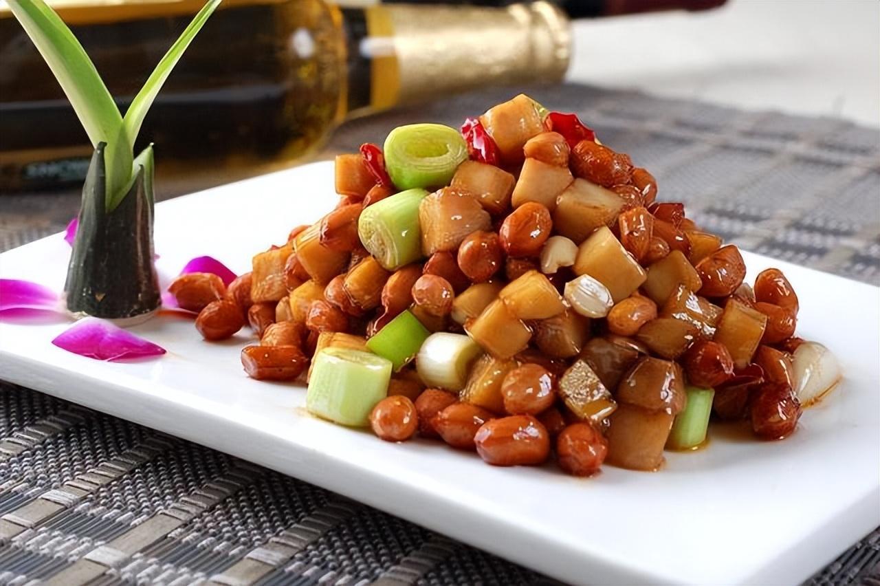 3.起锅烧油,下入干辣椒、花椒、葱丁、青红椒丁炒香,倒入碗汁,下入土豆丁、熟花生米、红油少许,快速翻炒均匀即可出锅。喜欢吃肉的朋友可以在炒的时候加入适量的鸡肉或者猪肉等食材。
