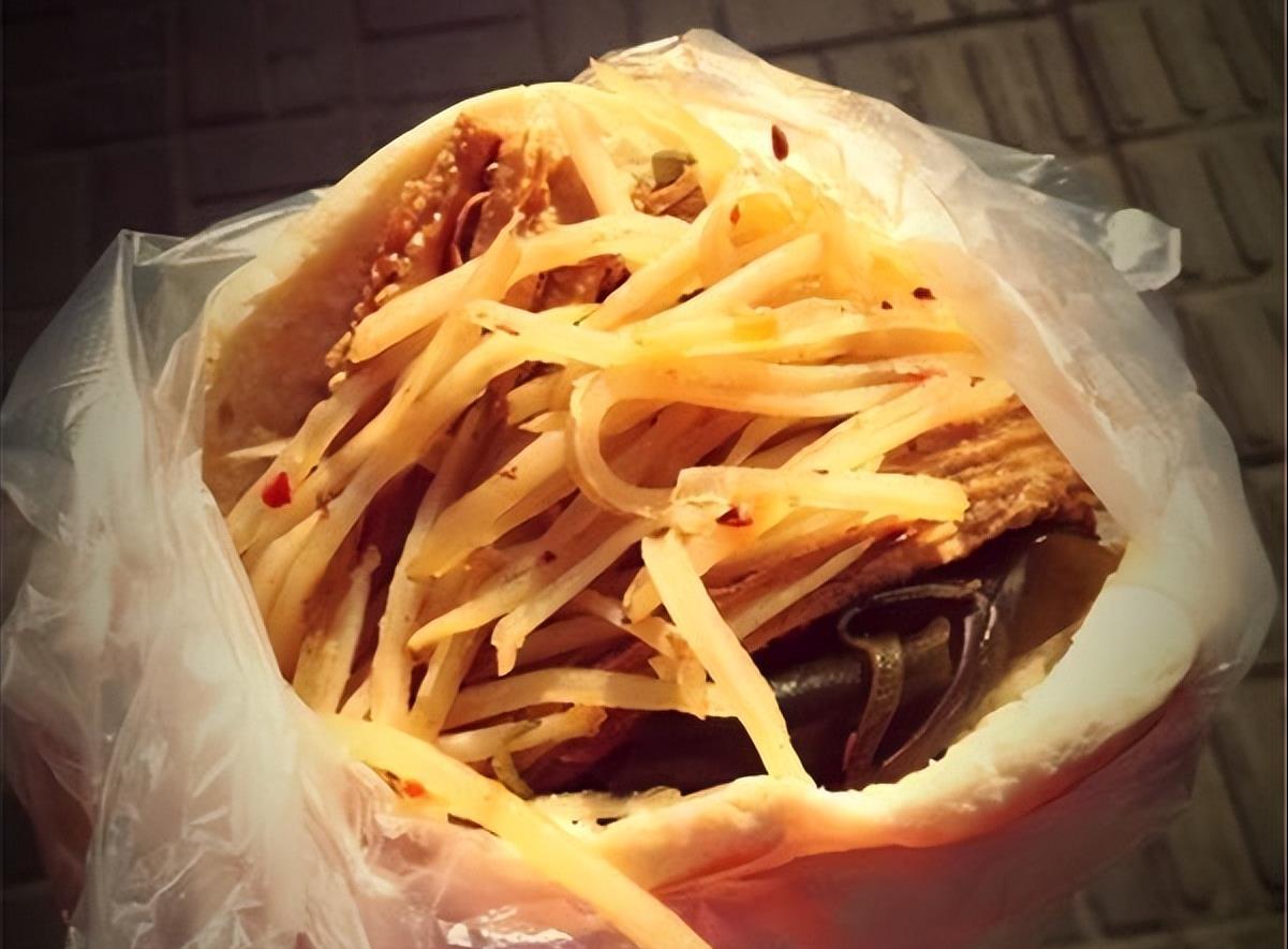 7.烙好的饼趁热划开口子,将炒好的酱香鸡肉土豆丝夹在里面,鸡肉土豆丝夹饼就做好了。