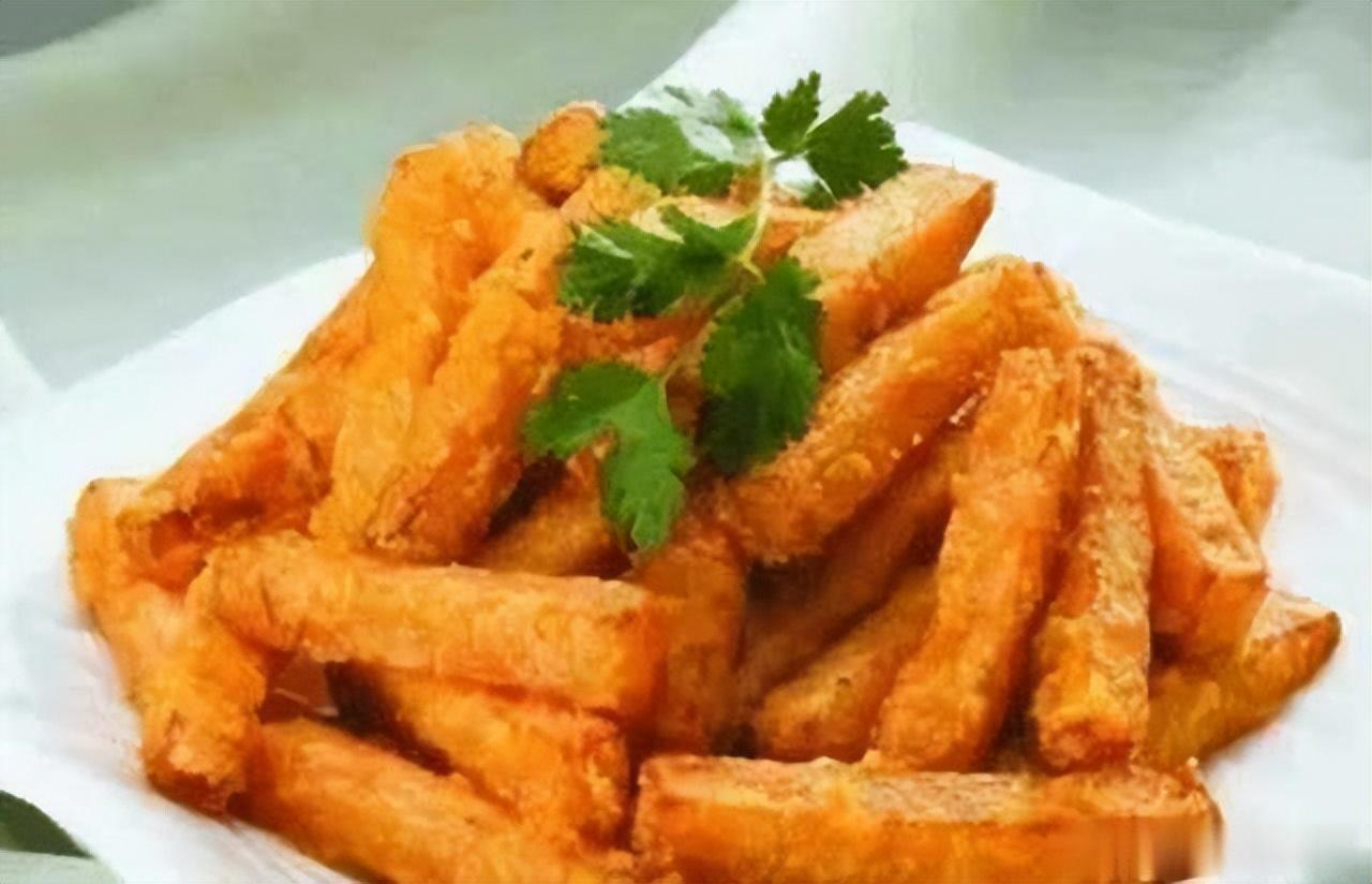 1.土豆去皮,切厚片,清洗2遍,油温六七成下入土豆片炸至金黄表皮酥脆。
