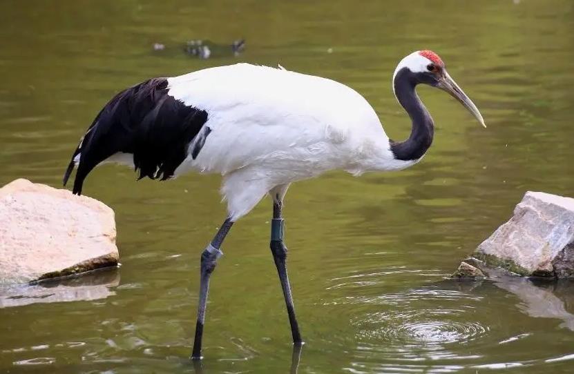 露出了头顶血管的颜色。而除了头顶,丹顶鹤通身黑白色。