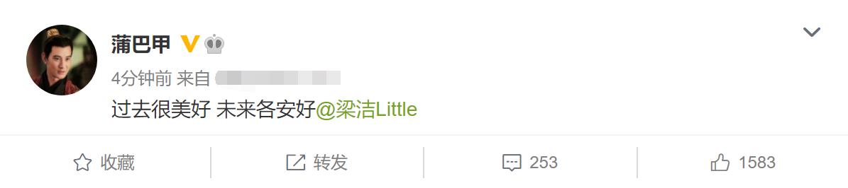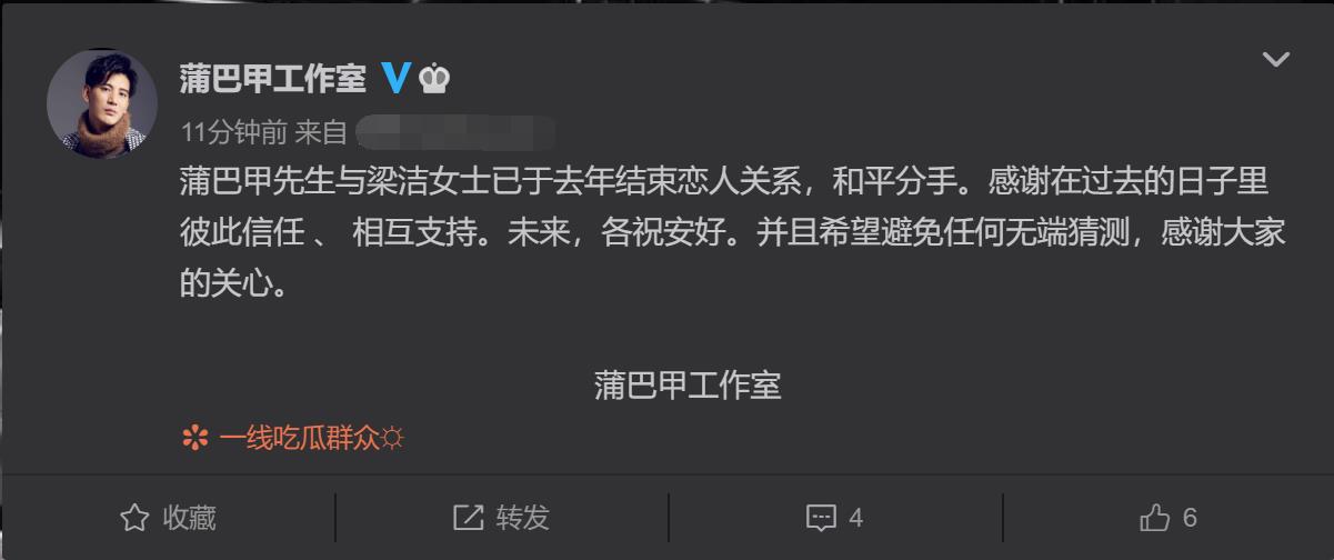 工作室发声后,蒲巴甲与梁洁的个人社交账号也发表了相同的文案,还专门艾特了对方,正式告别这段3年的感情。