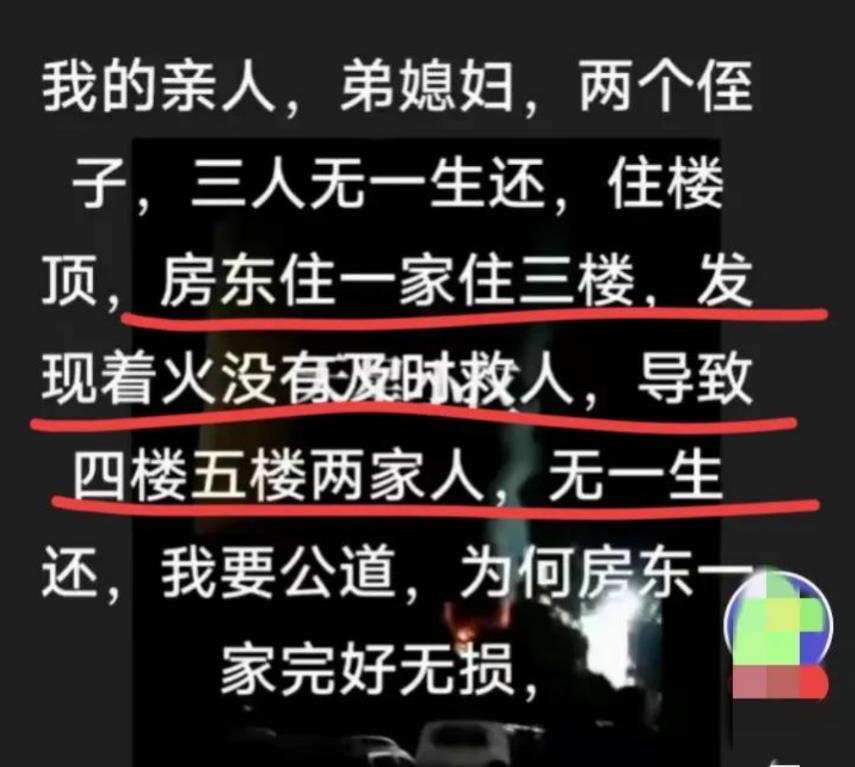 然后,根据相关人爆料,当时发生火灾时,房东在发现一楼产生火灾时,并没有第一时间通知楼上的租客,而是自顾自的先逃走了。