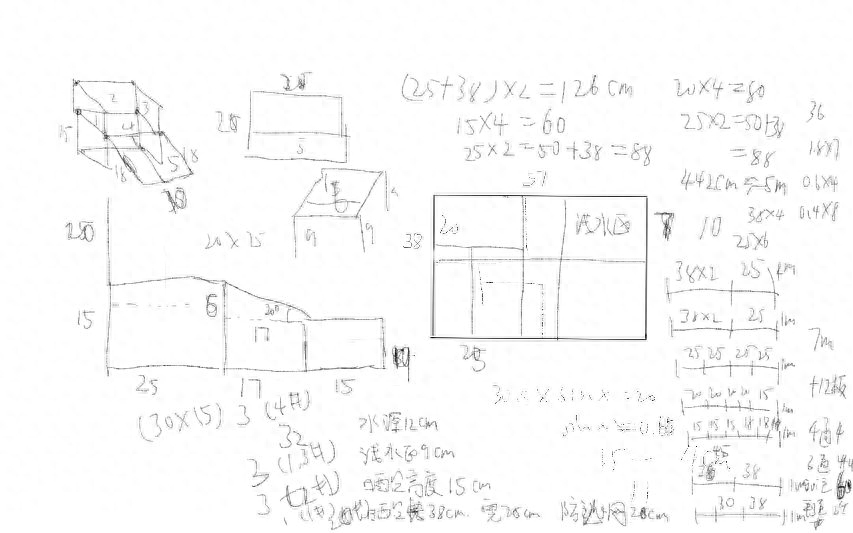 计划做一个38x25,高15的的晒台,在做一个38x15,高9的浅水台,最后水位可以升至13左右。设计了图纸,计算了材料量和种类。手画的,大家看个示意就好,