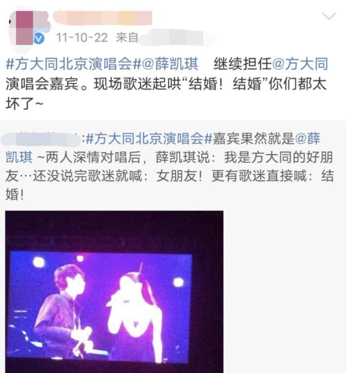 2011年,薛凯琪担任方大同演唱会嘉宾,全场粉丝都高喊两人快结婚。2014年曾经有粉丝在社交平台上集体喊话要帮方大同追求薛凯琪,甚至还帮他们做了各种CP图,可是他们却始终停在了友谊和爱情之间的暧昧地带。