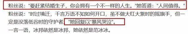 前不久,范冰冰久违更新社交平台,有粉丝深夜留言表示想念,范冰冰也回应:”早点睡,毕竟岁月留给我们的头发已经不多了。”。还有粉丝劝她早点结婚“赶紧结婚生子,你会拥有一个不一样的人生。”范冰冰也只用了四个字回答:“人间值得。”颇有些意味不明。