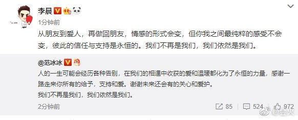 随后李晨转发表示:“从朋友到爱人,再做回朋友,情感的形式会变,但你我之间最纯粹的感受不会变,彼此的信任与支持是永恒的。我们不再是我们,我们依然是我们。 ”