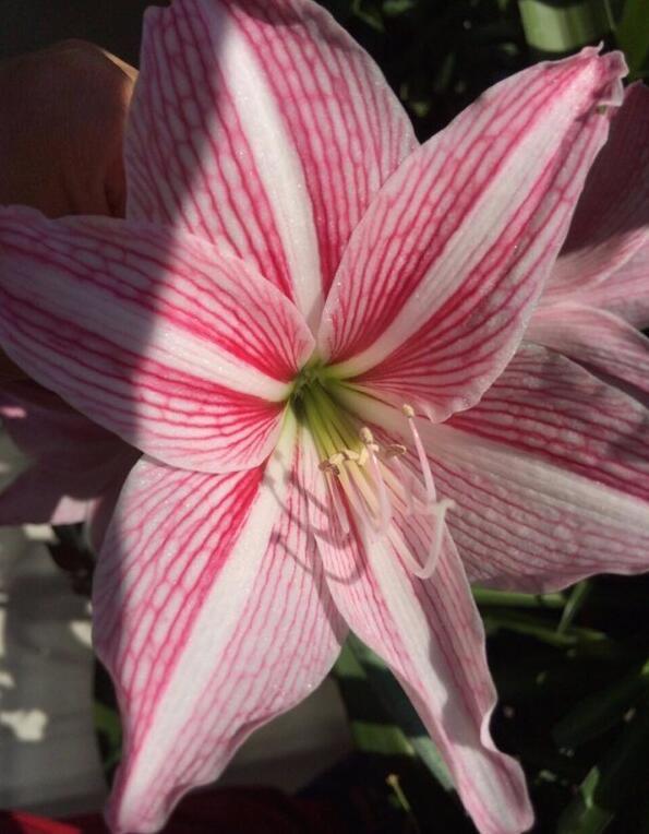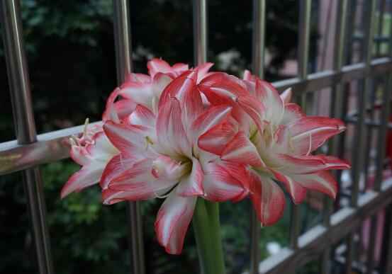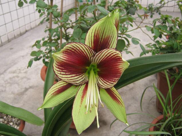 在众多品种中,凤蝶可以说是一个比较突出的品种,它的花瓣与大多数朱顶红花瓣都不一样,舒展的花瓣颜色相对较深一些,而且上面布满了白色的细条纹,看上去特别漂亮。