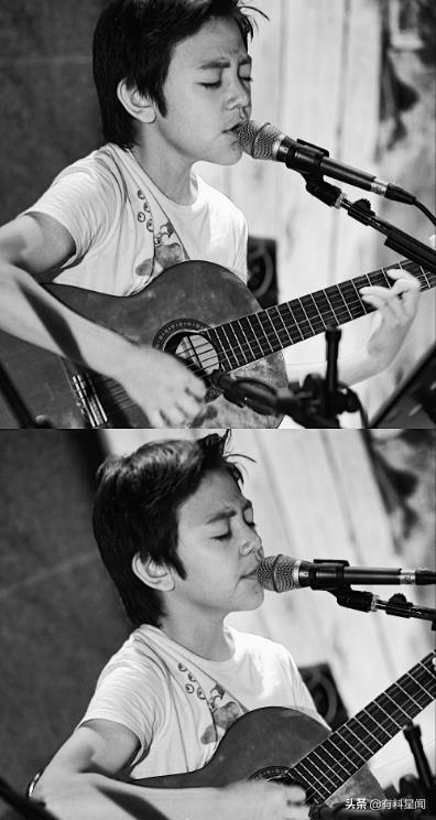照片中,诺一身穿白色T恤,看上去简单又清爽。还有6天就满11岁的诺一长相越来越帅气,鼻梁高挺,脸部线条流畅,睫毛又长又浓,五官精致,还遗传了妈妈的混血感,是个十足的大帅哥。镜头里的诺一弹着吉他自弹自唱,表情深情,一脸认真,文艺范儿十足,还带着点儿忧郁气质。