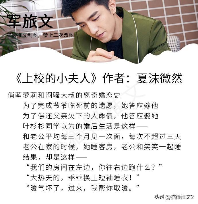 《上校的小夫人》作者:夏沫微然简评:梗虽是老梗,但真的甜。俏萌萝莉女主和闷骚上校男主,女主为了完成爷爷临死前的遗愿,答应嫁他。男主为了偿还父亲欠下的人债,答应娶她。先婚后爱军旅文,甜宠文,大叔文有年龄差,无虐超甜。