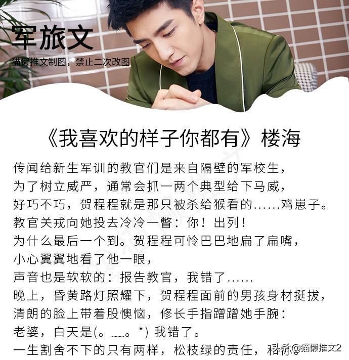 《我喜欢的样子你都有》 作者:楼海(本文又名《一不小心骂了老婆后选择何种下跪姿势会比较体面》)简评:男主军三代,年少时皮猴子野小子后来成熟稳重。女主软萌漂亮,比男主小两岁,俩人被家长指腹为婚。
