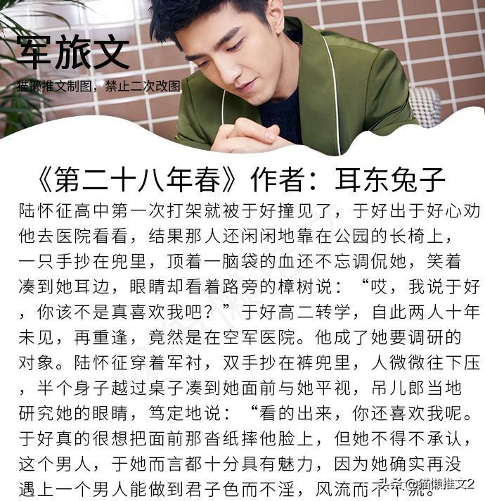 《第二十八年春》作者:耳东兔子(军旅高干文)简评:痞帅深情空军,漂亮蠢萌医生,男女主高中认识,互相喜欢可是还没在一起女主就转学了,十二年后再度遇见,两个人开始小心翼翼试探对方的心意。女主表面高冷,实际蠢萌可爱。对于周边逼婚情况,只想着到了年纪就一定结婚。而男主是从高中开始就是她唯一不反感的人。