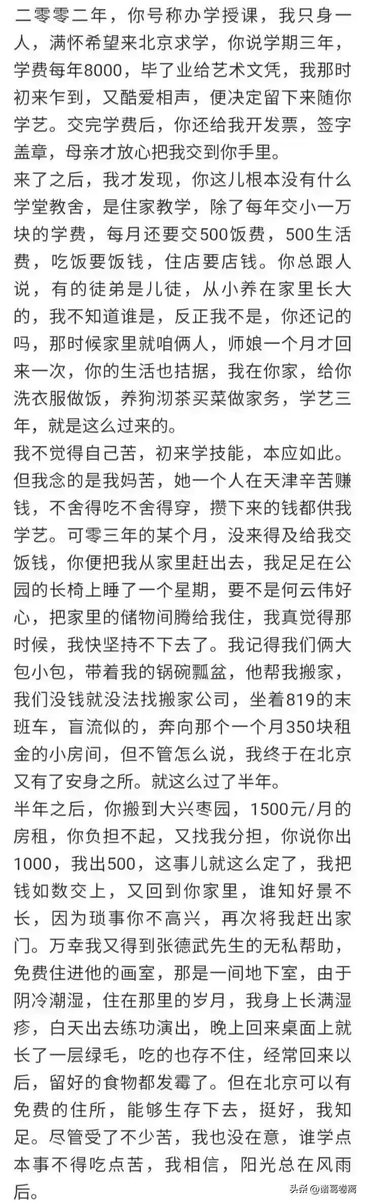 “德云社恢复演出后,我多次到德云社小剧场演出,并不收取任何演出费,只要我的底薪。可是那一天突然不让演了,去了被赶出来了。”