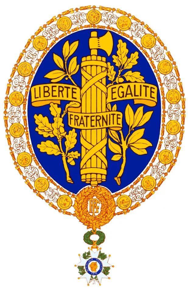 法国没有正式国徽,但传统上采用大革命时期的纹章作为国家的标志。纹章为椭圆形,上绘有大革命时期流行的标志之一——束棒,这是古罗马高级执法官用的权标,是权威的象征。束棒两侧饰有橄榄枝和橡树枝叶,其间缠绕的饰带上用法文写着“自由、平等、博爱”。整个图案由带有古罗马军团勋章的环带饰品所环绕。