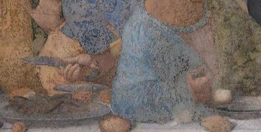 下面我们来看看(12号),他将头伸出来了,他的神情很夸张,好像在说:“谁,到底是谁干的,我要杀了他”,他有一只手是越过了前面一位的身体的,搭在了(13号)的身体上,另外一只手好像是在握着一把刀,在聚餐上面握着一把刀,这个动作很是奇怪,他是要干什么呢?要杀叛徒还是要杀耶稣呢?