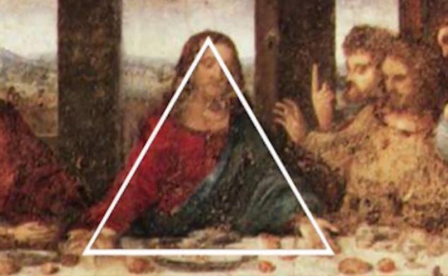 中间的耶稣两手摊开是一个正三角形,无论是从数学、物理、还是绘画上来说,三角形都是最为稳定的永恒的形状。