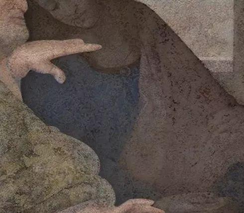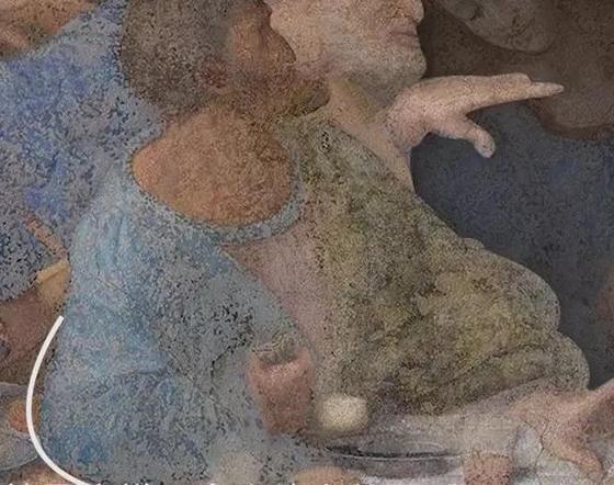 下面我们来分析分析耶稣,你可以看见他左手和右手的姿势是不一样的,左手是向上摊开的,右手是向下抓取,右边的肌肉是紧张的,因此达芬奇在这里隐藏了一个秘密,就是其实耶稣他是知道谁背叛了他的,背叛他的人其实不在他的左手边,而是他的右手边。
