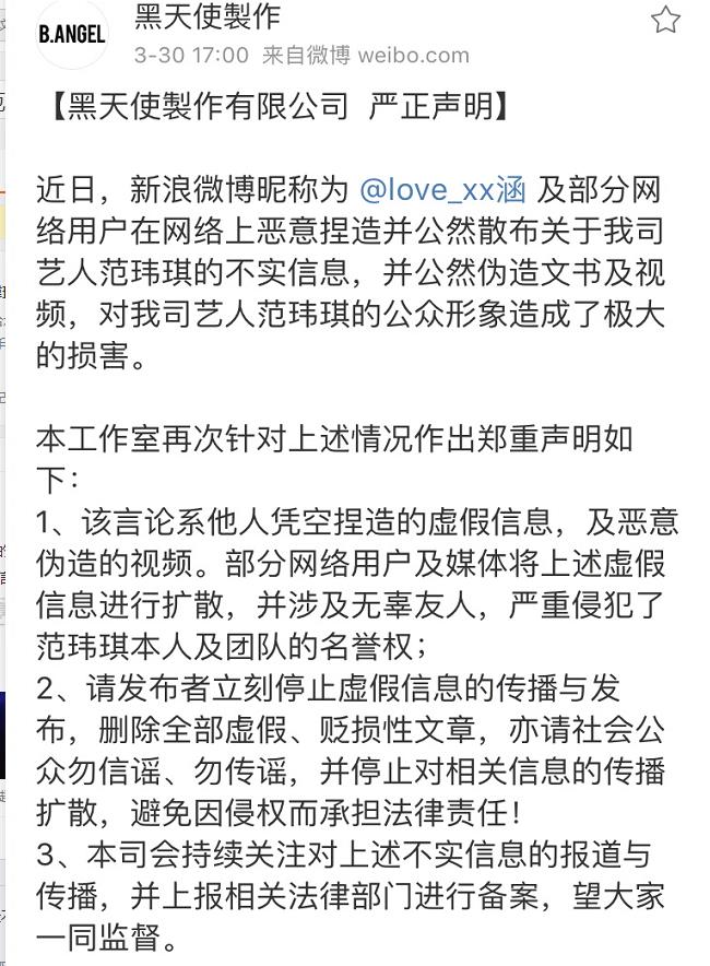 今天傍晚,范玮琪公司也发了严正声明,称网络上一些恶意捏造并公然散布关于范玮琪的不实信息对她造成极大的损害,范玮琪公司现要求发布者立刻停止虚假信息的传播和发布,并表示已上报相关法律部门备案。