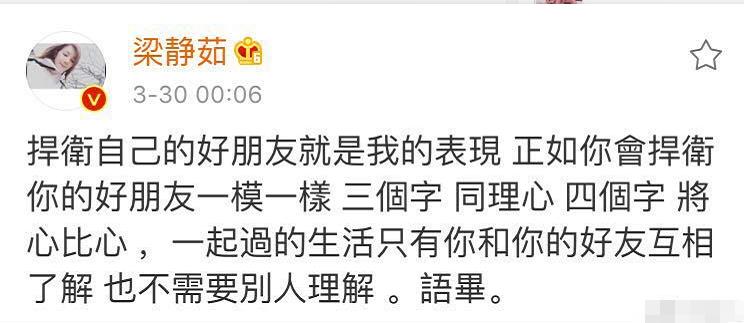 今日凌晨,梁静茹还发微博力挺好友范玮琪,称捍卫自己的好朋友就是自己的表现,并且微博取关了张韶涵,今天下午又重新关注被网友吐槽:情商太低。