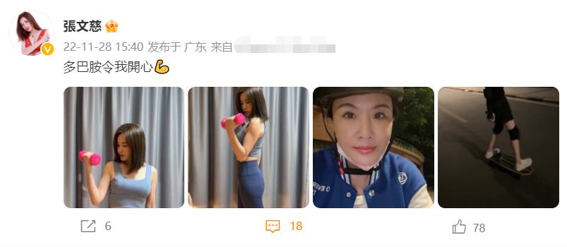 能维持那么好的身材,张文慈付出了非常多的努力,平日里她经常做运动,举哑铃之余,她还会去玩滑板。