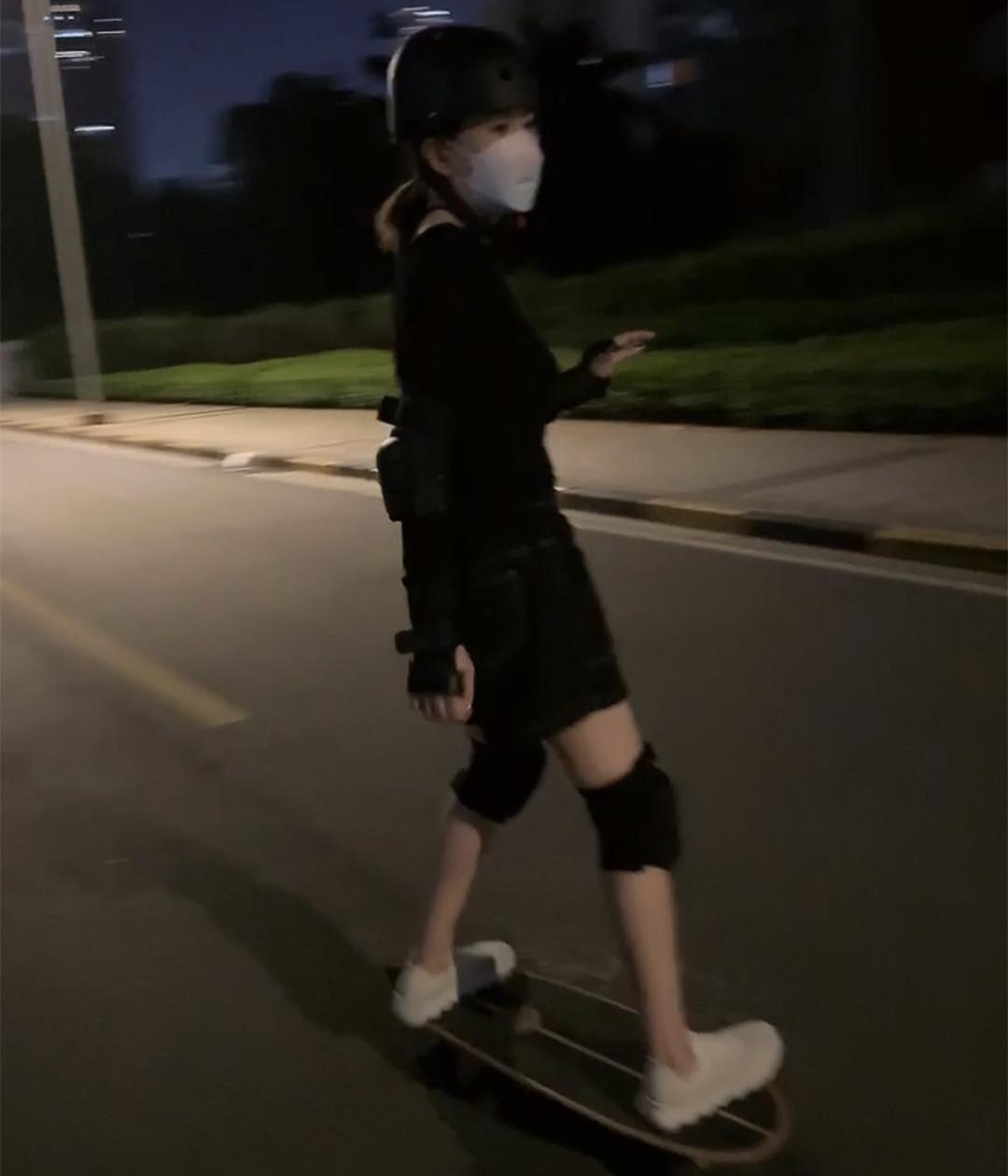 另一组照片中,她深夜现身街头玩滑板,她的平衡力相当不错,能稳稳地站在滑板上。