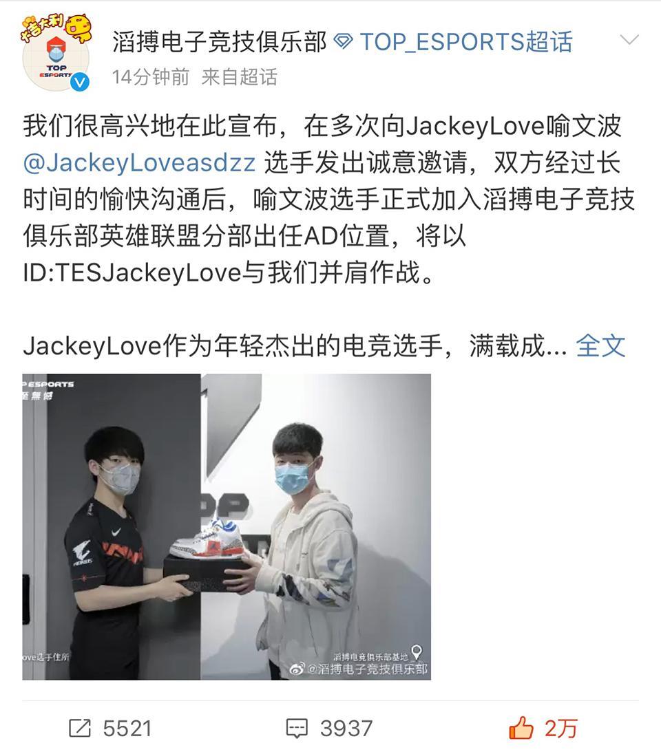 在今天,TES俱乐部正式官宣Jackeylove正式加盟!TES表示:JackeyLove作为年轻杰出的电竞选手,满载成绩与荣誉却不骄不躁。希望他的加入能够提升团队实力,一起向着终极目标发起冲击!