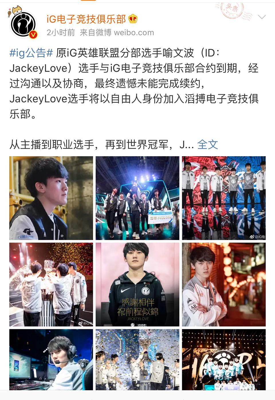 再见,IG.Jackeylove!IG微博发文:感谢陪伴,祝前程似锦