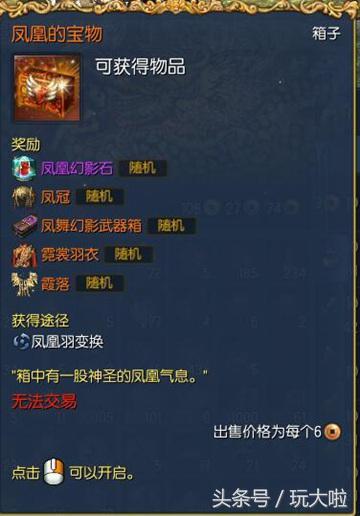 补充一下,一个宝箱的获取需要的有:10个凤凰羽(约200RMB)+1个金属模具(约10RMB)+20高级衣料(约5RMB),所以折合下来得一个箱子大致是需要215块钱,所以希望大家能先攒攒好运再来开箱子,据说有人连开十个都没成功。