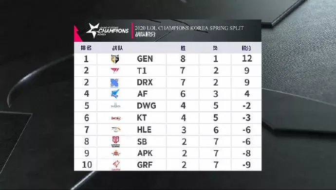 LCK春季赛首轮最终排名出炉:Gen.G第一SKT第二,GRF巨惨联赛垫底