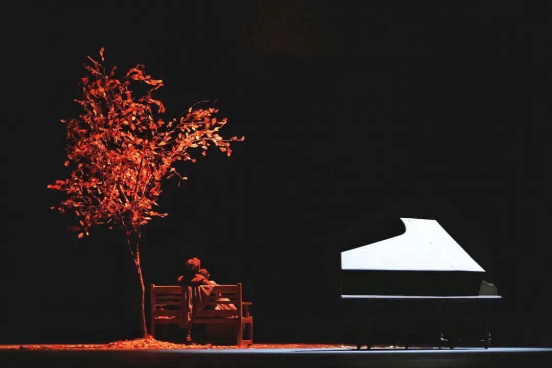 舞台上,一棵落英缤纷的秋树、一架古香古色的钢琴、一条漆色斑驳的长椅,简·爱与罗彻斯特就幸福的依偎在长椅上,在舞台的旋转中,慢慢走向岁月深处……