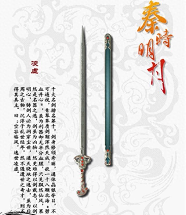 十、凌虚,张良的配剑,剑身修颀秀丽,通体晶银夺目,虽为利器却无半分血腥,只见飘然仙风。