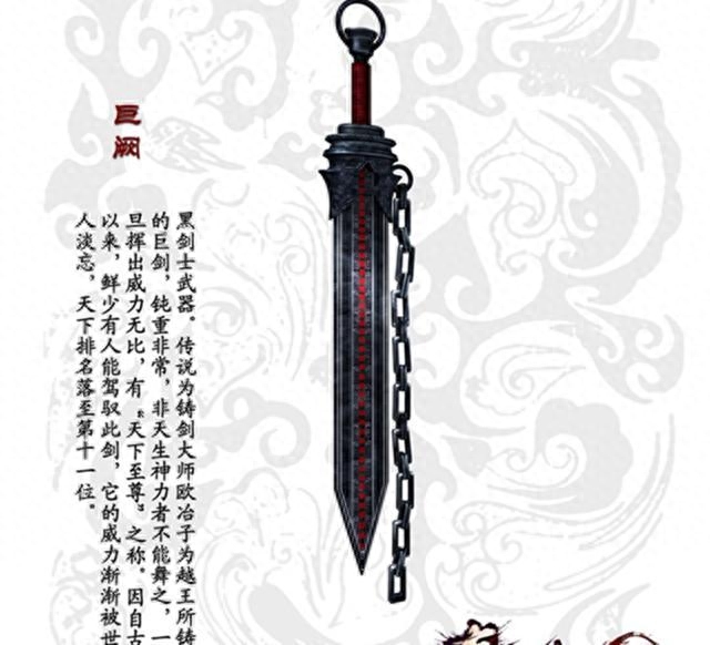 十一、巨阙,胜七的配剑,钝重非常的巨剑,非天生神力者不能舞之,一旦挥出威力无比,开山裂石,号称天下至尊。