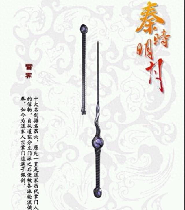 六、雪霁,道家人宗掌门逍遥子的配剑,原是道家历代掌门信物,自从道家分裂成天人二宗后便由二宗掌门通过比武来争夺。