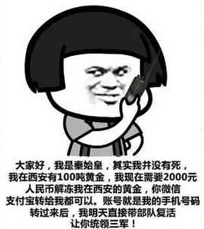 大家好,我是秦始皇,其实我并没有死,我在西安有100吨黄金,我现在需要2000元人民币解冻我在西安的黄金,你微信,支付宝转给我都可以。账号就是我的手机号码!转过来后,我明天直接带部队复活,让你统领三军!