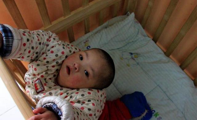 这个孩子简直萌翻了,小家伙好可爱哦,想从睡柜里爬出来,好聪明哦。这样可爱的宝宝怎么会来孤儿院了呢?