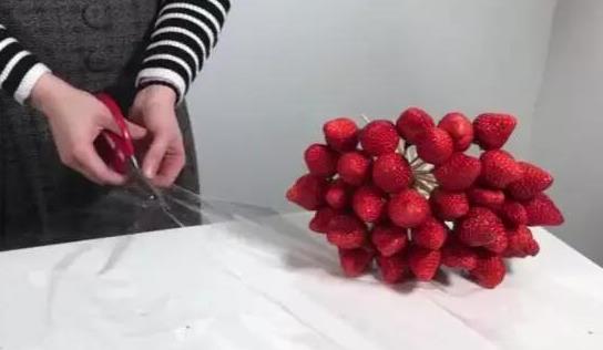 6.用玻璃纸包裹底部,防止草莓竹签滑落。