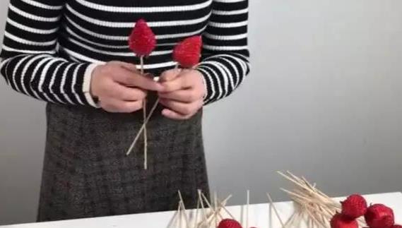 2.竹签插入草莓2cm左右的深度。