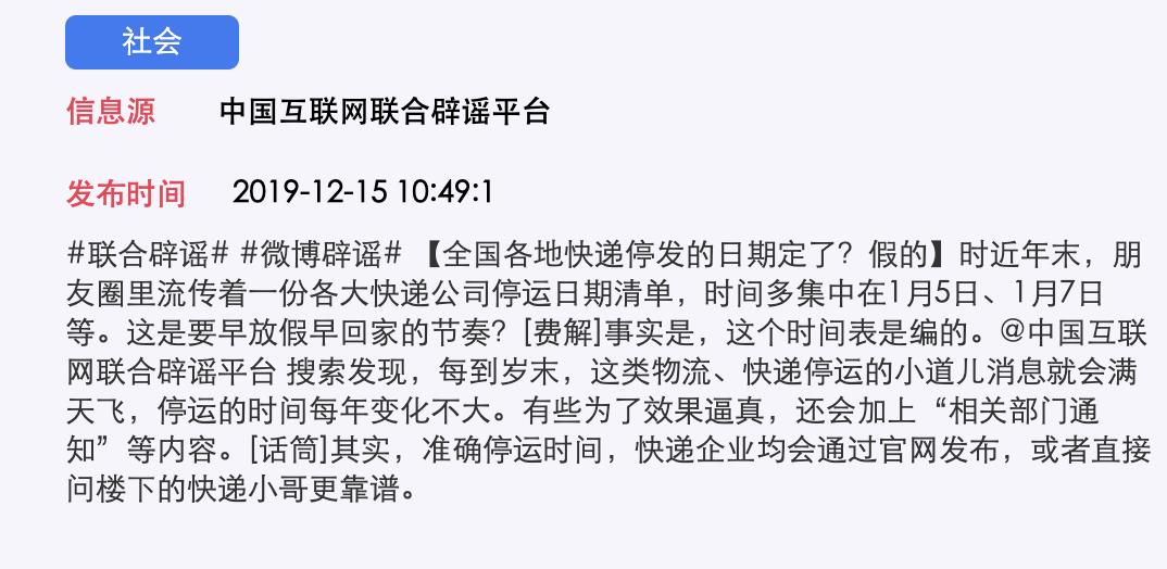 AI识谣系统在经过智能收集分析网络讯息后获知,昨日10时48分许,中国互联网联合辟谣平台即通过其官方微博针对上述消息进行了辟谣:“事实是,这个时间表是编的。”据搜索发现,每到岁末,这类物流、快递停运的小道儿消息就会满天飞,停运的时间每年变化不大。有些为了效果逼真,还会加上“相关部门通知”等内容。其实,准确停运时间,快递企业均会通过官网发布,或者直接问楼下的快递小哥更靠谱。